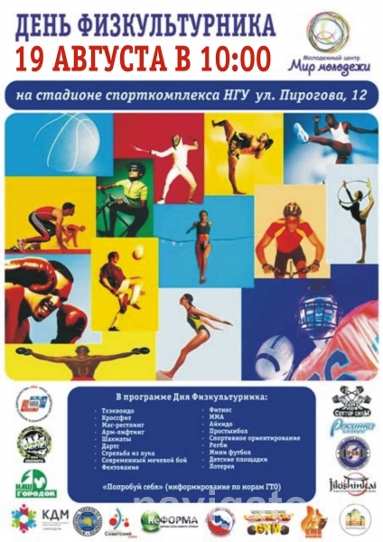 Центр «Мир молодёжи» 19 августа в 10 часов приглашает всех на стадион спорткомплекса НГУ (ул. Пирогова, 12). В программе спортивного праздника - соревнования по тхэквондо, кроссфиту, мас-рестлингу, армлифтингу, шахматам, дартсу, стрельбе из лука, фехтованию, фитнесу, ММА, айкидо, простынболу, спортивному ориентированию, регби, мини-футболу, современный мечевой бой. Будут работать детские площадки. Гостям расскажут о сдаче норм ГТО.