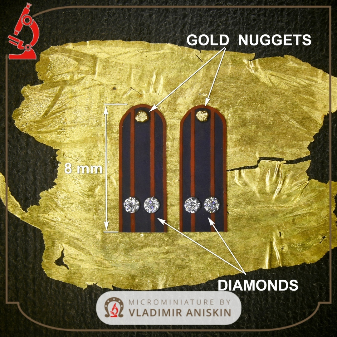 Длина погонов – 8 миллиметров, лежат они на золотой пластинке. Для придания поделке подарочного вида создатель поместил её в эффектную рамку.