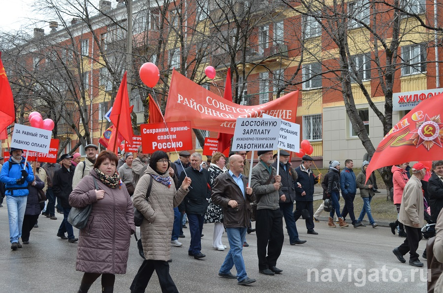 В руках шествующих плакаты: «За равный труд равную оплату!», «Правительство Медведева в отставку», «Власть щедра у нас на МИФЫ, а растут одни ТАРИФЫ», «Сохраним армию – спасем Россию». Есть в колонне и уже знакомые многим жителям Советского района плакаты зеленых: «Хотим думать в лесу», «Отстоим лаврентьевский Академгородок», «Хочу жить в городе-лесе, а не каменном мешке». С этими лозунгами проводились протестные акции.