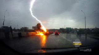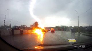 Если смотреть на фотографии, то кажется, что от удара молнии автомобиль загорелся. Но это не так. Разряд, видимо, прошел вскользь, удавив в асфальт. При этом была сильная вспышка.