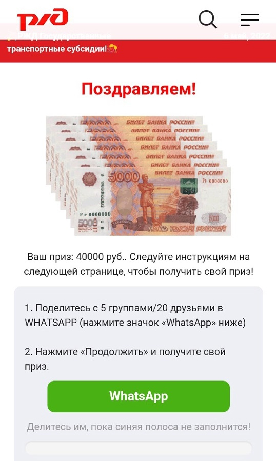 6 мая в мессенджере Whatsapp пользователи стали получать сообщения: Российские железные дороги предлагают пройти опрос, ответить всего на 4 вопроса, и получить шанс выиграть транспортную субсидию в размере 40 тысяч рублей.