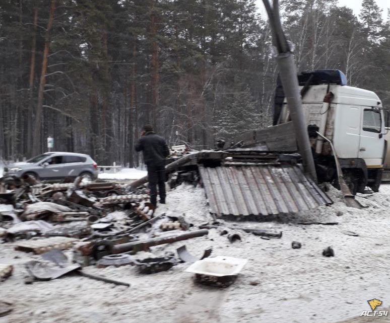 На Бердском шоссе грузовик МАЗ снес фонарь и перекрыл дорогу