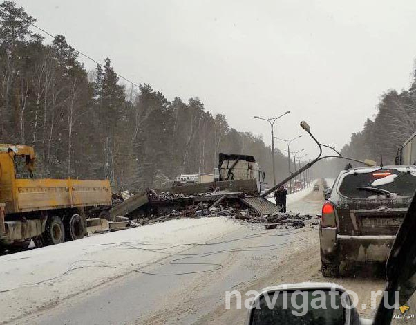 Согласно информации в группе АСТ-54, на Бердском шоссе перед улицей Русской при движении в сторону Речного вокзала грузовик МАЗ с прицепами залетел на отбойник на разделительной полосе и снёс фонарь.