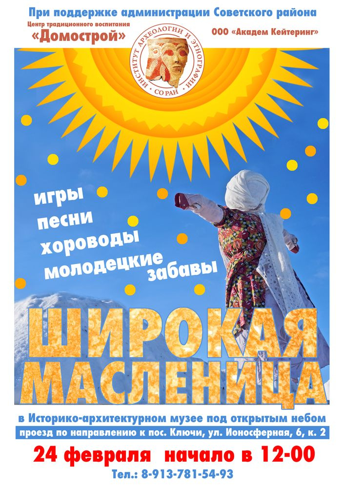 Традиционное праздничное народное гуляние «Встреча Масленицы» состоится 24 февраля в историко-архитектурном музее под открытым небом Института археологии и этнографии СО РАН (ул. Ионосферная, 6). Начало в 12 часов.