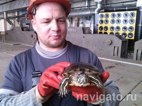 "Ребята из службы эксплуатации, а точнее - машинист крана Женя Преображенский и слесари по такелажу и грузозахватным приспособлениям Егор Крымский и Петр Литвинов при проведении работ на щитовом отделении (подъеме сороудерживающей решетки в блоке гидроагрегата №7) увидели? что в воде проема плавает черепаха. С помощью сачка ребята поймали и принесли спасенную в мастерскую. "Она бедная сильно замерзла, просто ледяная была", - рассказывает Петр Литвинов. В данную минуту она себя вполне комфортно чувствует: плавает в теплой воде в аквариуме электротехнической лаборатории Новосибирской ГЭС. Судьба этой девочки определена. До понедельника ее к себе на передержку возьмет начальник службы технологических систем управления Андрей Локтионов, а в понедельник Андрей Викторович передаст найденыша начальнику участка СТСУ  - у Василия Ивановича большой опыт, и у него дома ее ждет подруга, такая же красноухая ".