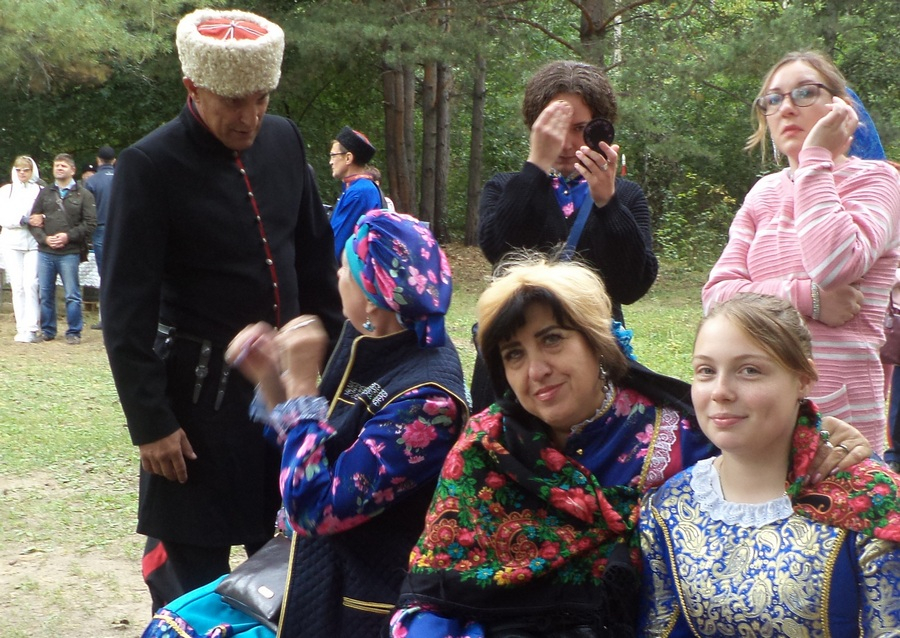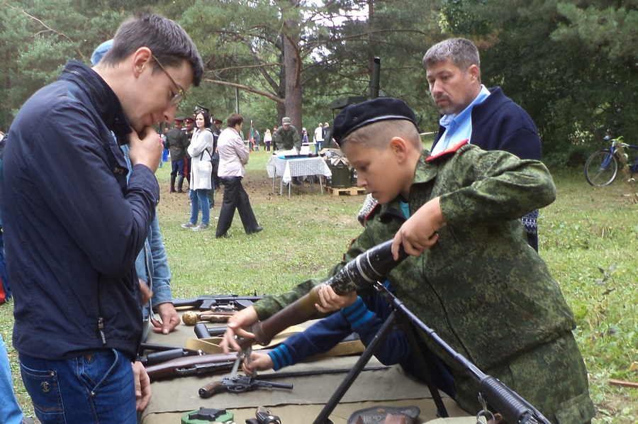 Выставка оружия возле казачьего куреня привлекала не только маленьких, но и взрослых посетителей. Как показала практика, познания даже самых молодых казаков не уступают тем, кто уже отслужил в армии. Можно без преувеличения сказать, что верная служба Отечеству – главная часть жизни настоящего казака. Каждый из собравшихся на этой поляне честно исполнил свой долг, многие воевали в горячих точках, а потом нашли своё призвание в преподавании, военно-патриотичном воспитании молодёжи и частной охранной деятельности.
