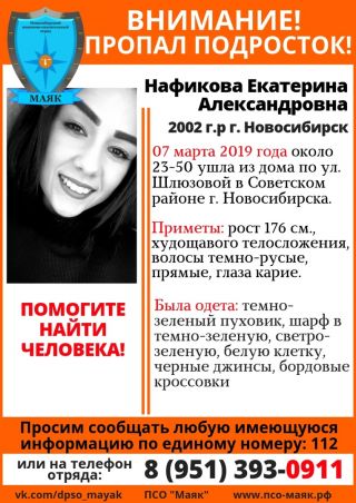 Поисковый отряд «Маяк» просит помощи в розыске и распространении информации о пропавшей несовершеннолетней Екатерине Нафиковой. 7 марта около 23.50 ушла из дома по улице Шлюзовой, и до настоящего момента ее местонахождение не установлено, – сообщают волонтеры.