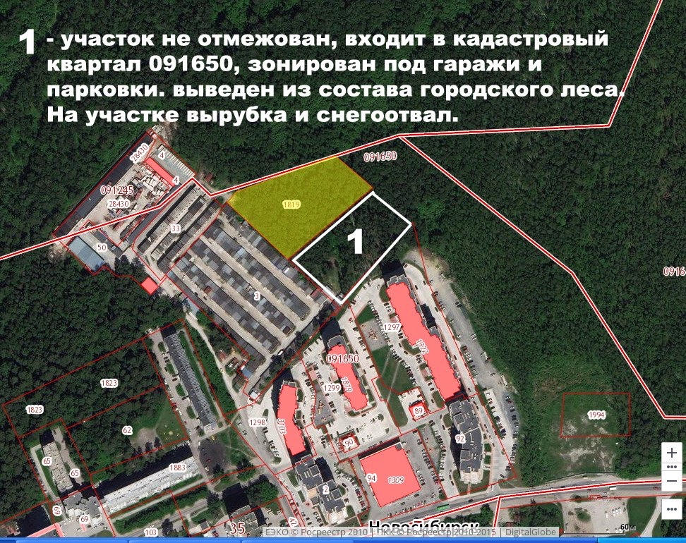 Однако сегодня часть лесных зон, несмотря на обещания мэрии выявить и включить в состав лесов участки, по факту ими являющиеся, остается в зоне застройки, и мэрия выступает за строительство на этих участках. Например, идёт борьба за участок 54:35:091650:1819 и за примыкающий к нему на Шлюзе в Советском районе за гаражами на ул. Балтийской (на карте обозначен цифрой 1). В настоящий момент идет судебное разбирательство. Прокуратура города Новосибирска настаивает на включении участков леса в лесоустройство.