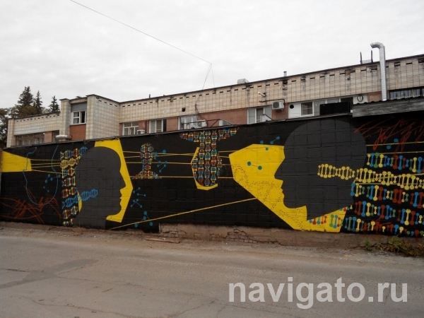 «Это граффити о тайне, которую хранит в себе человек, про генетический код», — пояснила корреспонденту НГС.Новости организатор фестиваля «Графит науки» Янина Болдырева. По задумке Эльвиры, тёмный фон на рисунке — это тайны человеческого мозга и неизвестность перед будущим, которое ожидает человека. На чёрном фоне изображены молекулы ДНК, которые, по мнению автора рисунка, «сейчас подвергаются серьёзным генетическим изменениям».