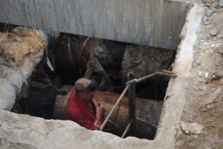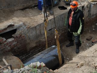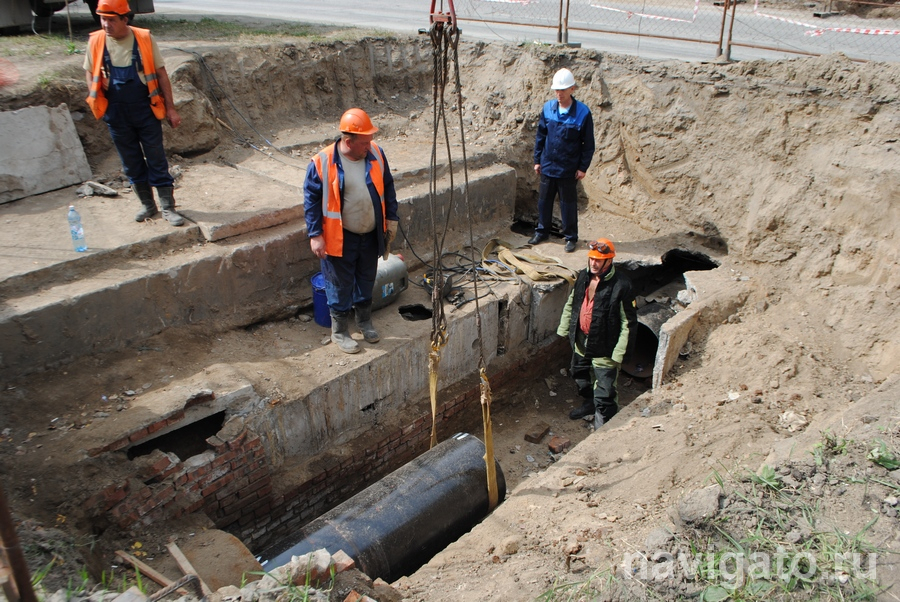 Чтобы извлечь старую трубу и заменить ее на новую, вырыли три котлована: по обеим сторонам проезжей части и на разделительном газоне. Горячее водоснабжение на этом участке перекрыто. Разрезая на небольшие участки поврежденный трубопровод, работники вытаскивают его, взамен в бетонные лотки тоже частями укладывают новую трубу. Опытный сварщик Виктор Вялков уже приварил новые участки к основному трубопроводу, осталось только врезать завершающий блок. Затем проведут укладку изоляции, заменят плиты защитного лотка – и работы на подающем трубопроводе будут завершены. То же самое нужно будет сделать и на обратном трубопроводе.