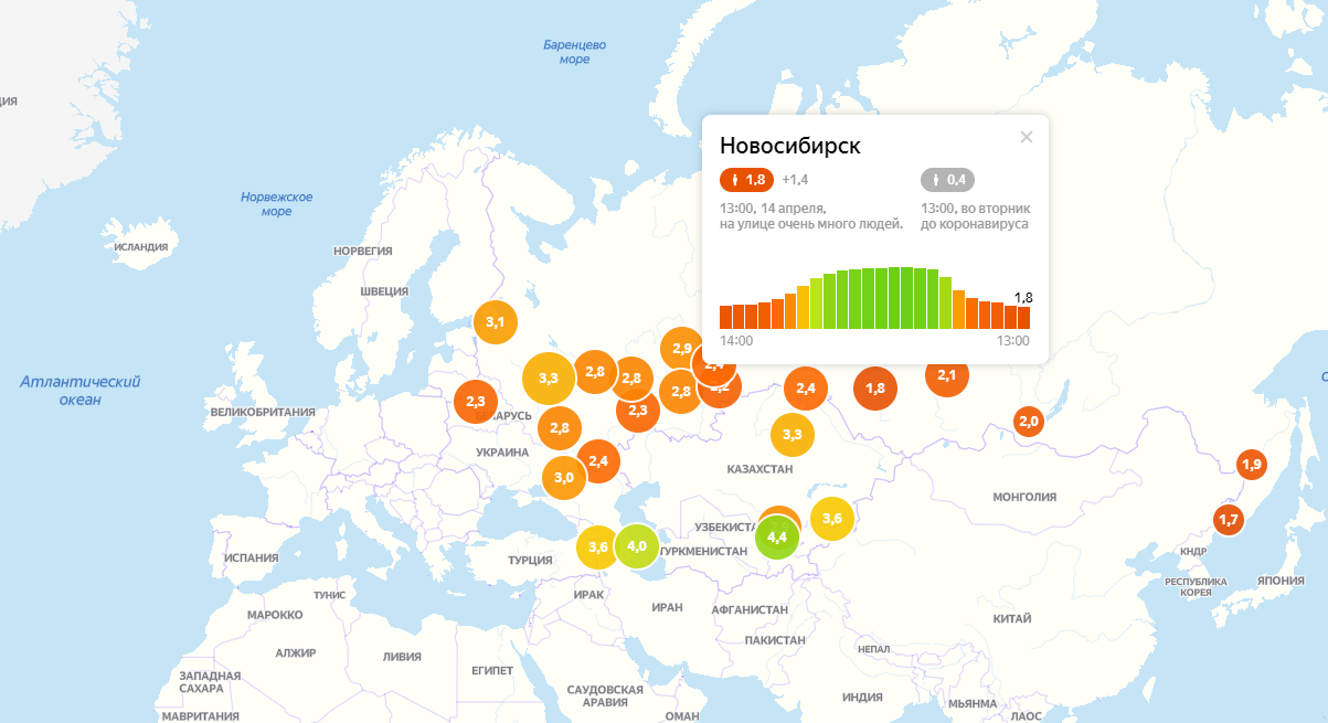 Если в первую неделю после введения ограничений индекс самоизоляции новосибирцев был 3,9 балла, то в последние дни он резко упал до 1,8 баллов с пометкой «На улице очень много людей». Среди городов-миллионников (а их в списке самоизоляции 18) столица Сибири занимает худшую позицию.