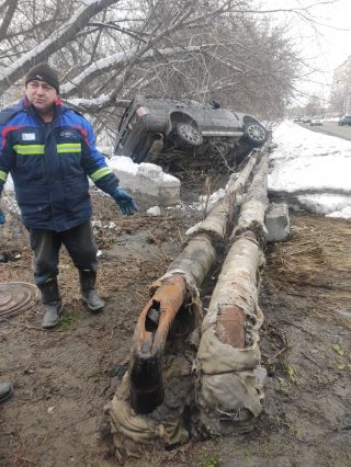 Автомобиль до сих пор находится на месте аварии – передом висит на трубах. Там же работают и представители теплосетей. Они устраняют дефект на трубопроводе.
