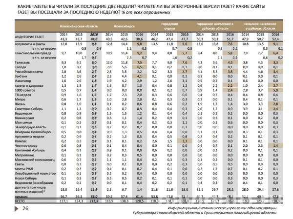 Результаты социологического исследования «Аудитория и рейтинг средств массовой информации в Новосибирской области», проведенного информационно-аналитическим управлением администрации губернатора и правительства региона, представлены 25 ноября.