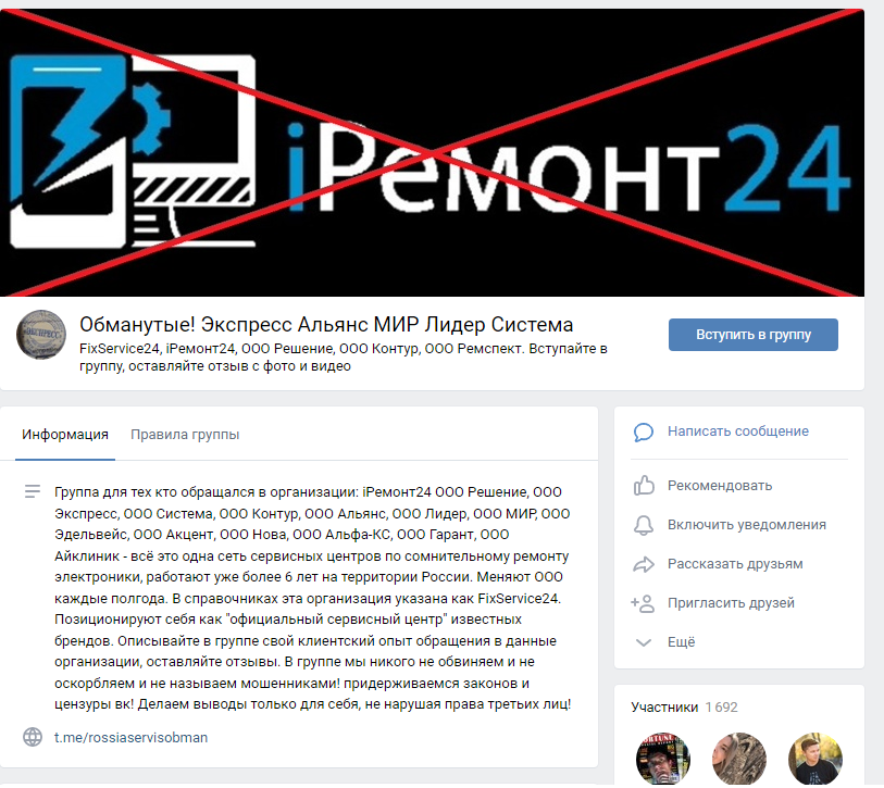 В соцсетях создана группа, в которую входят 1686 человек, недовольных работой сервисного центра. География подписчиков – вся страна, поскольку филиалы компании есть во многих городах. Основной отзыв такой: это мошенники.