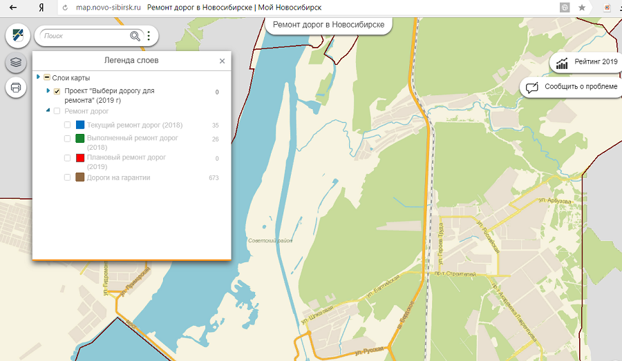 Посмотреть карту проблем в рамках проекта «Выбери дорогу для ремонта-2019» можно на новом геоинформационном портале «Мой Новосибирск» в разделе «Ремонт дорог» и на старой версии системы «Мой Новосибирск» в разделе «Сообщения». Для этого необходимо пройти регистрацию в «Личном кабинете». Зарегистрированный пользователь имеет возможность отметить участок, требующий ремонта (или несколько участков) прямо на карте города в специальной категории меню «Рейтинг «Выбери дорогу для ремонта». В сообщении можно прикрепить фотографию поврежденного участка, дать дополнительную информацию о характере проблемы на этом участке (например, «проспект Дзержинского, дом № 3, повреждение полотна проезжей части»).