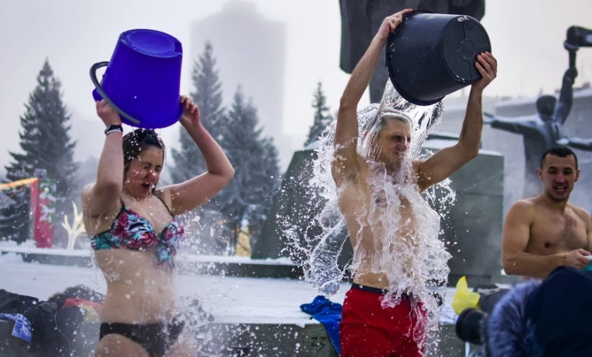 27 декабря возле памятника Ленину в Новосибирске собрались 20 человек. Молодые люди разделись и поочередно вылили на себя по ведру ледяной воды. Так сибиряки собираются сделать 14 раз.