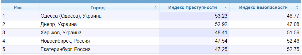 Если же смотреть на общую картину, то возглавляет список Одесса: здесь индекс преступности достиг отметки в 53,23. А самая низкая преступность – в городе Клуж-Напока в Румынии (20.43).