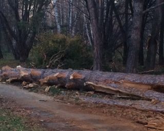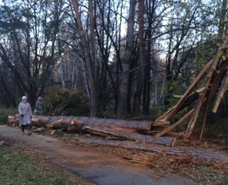 Два больших дерева во время ветра упали на улицах Академической и Мальцева. Как оказалось, внутри они были гнилыми. Деревья сегодня должны были распилить и вывезти. Однако напротив гимназии №5 за день все сделать не успели. Сосна оказалась огромной, с нее обрубили ветви. Но с самим стволом еще придется повозиться.