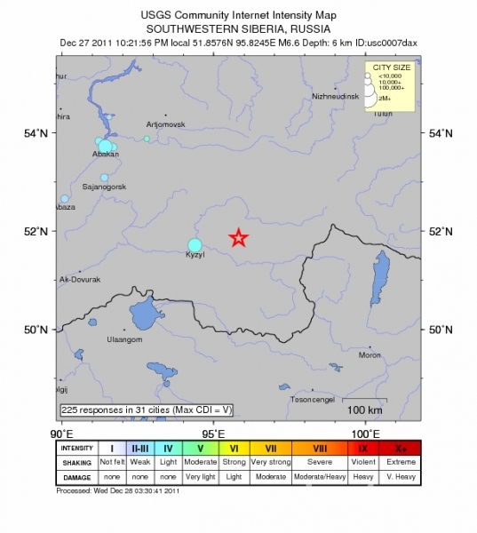 Вчера в 19:21:15 по московскому времени на территории Кызыльского района Республики Тыва, в 97 км от города Кызыл произошло землетрясение с интенсивностью в эпицентре 8 баллов по шкале MSK-64, магнитуда 6,0. Оно ощущалось на территории Тывы, Хакасии, Красноярского края, в Новосибирской и Кемеровской областях. Нарушений электроснабжения в Сибирском федеральном округе не произошло. По информации филиалов РЖД, в Сибирском федеральном округе нарушений ж/д движения нет. На потенциально-опасных объектах происшествий нет.