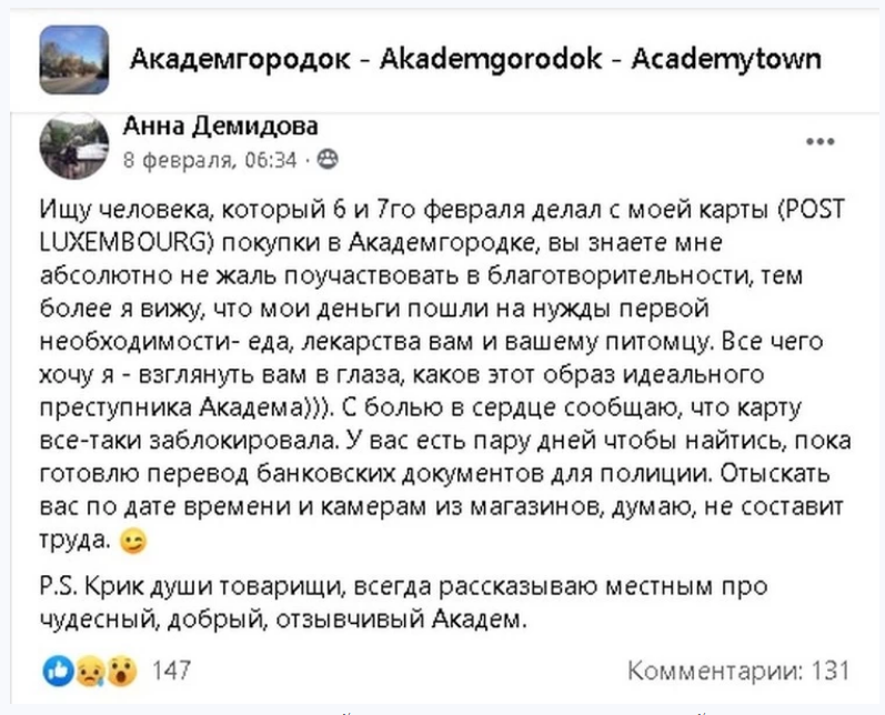 – Ищу человека, который 6 и 7 февраля делал с моей карты (Post Luxembourg) покупки в Академгородке. Вы знаете, мне абсолютно не жаль поучаствовать в благотворительности, тем более я вижу, что мои деньги пошли на предметы первой необходимости – еду, лекарства. Всё, чего хочу я, – взглянуть вам в глаза. Каков образ идеального преступника Академа? – написала Анна Демидова.