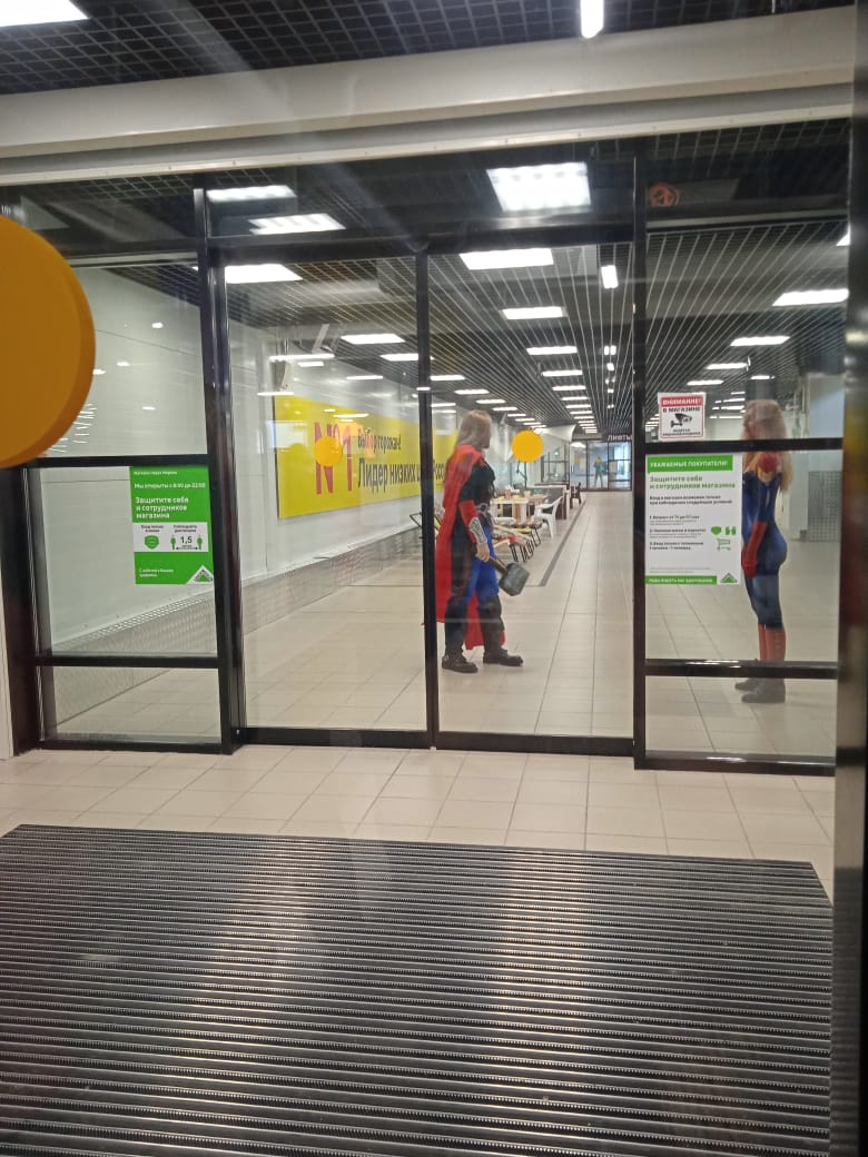 У самого входа гостей встречают Супермен с большим антуражным молотком и его стройная суперподруга. На стеклянных дверях объявление, что здесь ждут посетителей от 14 до 65 лет в масках и перчатках. На самом деле с радостью приветствовали всех. Оценить новый магазин смогли и школьницы 5-6 класса, покупавшие подарок бабушке, и даже маленькая рыжая собачка, которая не пожелала остаться в машине на парковке.