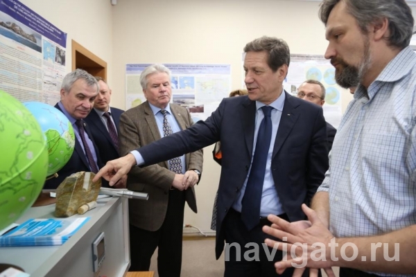 Программа рабочей поездки включала в себя визит в лабораторию геодинамики и палеомагнетизма Центральной и Восточной Арктики НГУ. Здесь первого вице-спикера удивили огромной клеткой, где искусственно создается и поддерживается магнитный вакуум. Академик РАН декан ГГФ НГУ Валерий Верниковский объяснил, что в лаборатории изучают геологическую историю Арктики. Образцы горных пород содержат информацию о древнем геомагнитном поле. С помощью этих данных можно восстановить местоположение породы много миллионов лет назад и в итоге воссоздать облик Арктики, какой она была в древности.