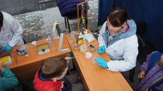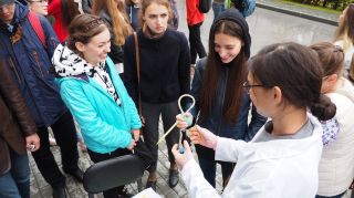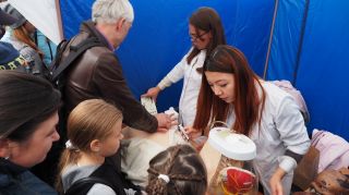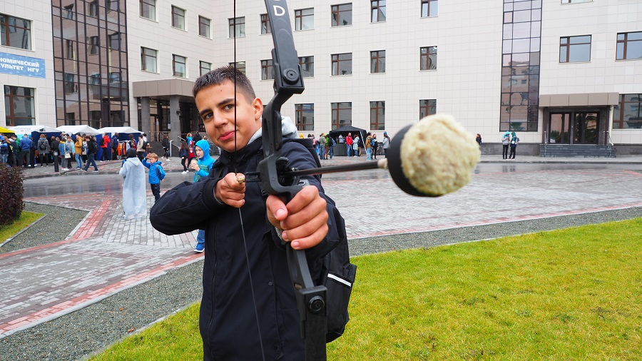 Для гостей и студентов во внутреннем дворике вуза было всё – от горячего чая и вкусных пирожков до увлекательных опытов и игр. Пока одни штурмовали палатки, где студенты НГУ рассказывали и показывали, чему их учат на факультетах, другие с азартом стреляли из луков.