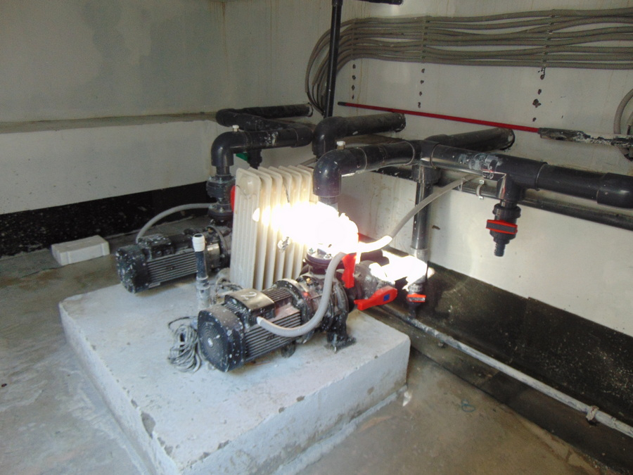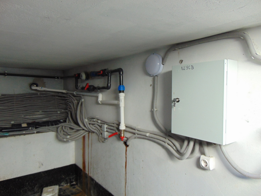 Отказаться от приглашения Вячеслава Викторовича посмотреть техническое помещение, где находится «сердце» фонтана, просто невозможно: любопытно узнать, как все устроено! Вячеслав Кузьмин открывает люк, находящийся неподалеку, и мы спускаемся по лесенке вниз. В «подвале» установлены 4 насоса, подающие воду на каждый ряд струй, система подкачки воды (автомат регулирует, когда уровень уменьшается из-за испарения, и поддерживает один и тот же объем). Система фильтрации постоянно очищает воду, которая к тому же еще и хлорируется. Раз в неделю фонтан будут мыть, проводить профилактические работы.