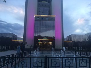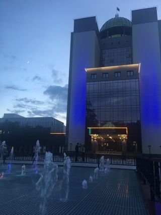 Площадка перед НГУ особенно эффектно смотрится вечером. Многие приходят сюда полюбоваться на перелив подсвеченной воды. Да и сам университет в темноте выглядит завораживающе.
