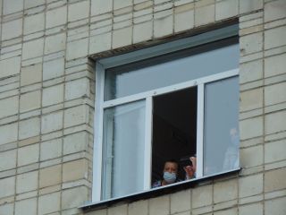Из окон больницы с интересом выглядывали пациенты и медработники. Некоторые из сотрудников медучреждения смогли выйти на крыльцо и немного отдохнуть, слушая русские народные песни.