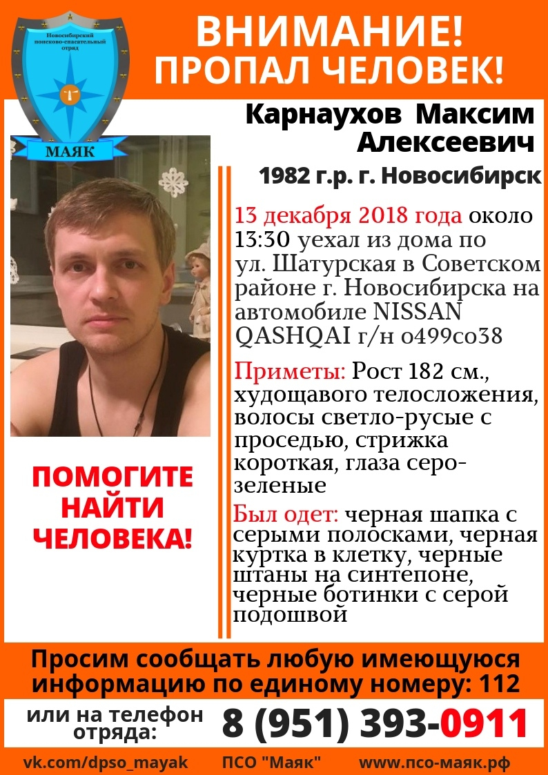 Поисковый отряд «Маяк» просит помощи в розыске и распространении информации о пропавшем Карнаухове Максиме Алексеевиче, 1982 года рождения.