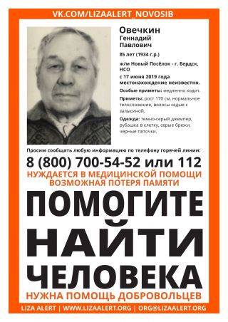 Волонтеры отряда «Лиза Алерт Новосибирск» просят помощи в поисках пропавшего Геннадия Павловича Овечкина.
