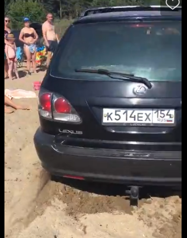 Водитель Lexus RX300 вместе со своей спутницей решил не набирать песка в обувь и, не выходя из машины, максимально близко подъехать к воде, минуя отдыхающих на берегу горожан.