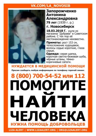Внимание! Пенсионерка нуждается в медицинской помощи (возможна потеря памяти). Если вы видели Антонину Александровну, позвоните по телефонам: 8 800 700 54 52 или 112.