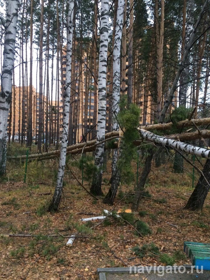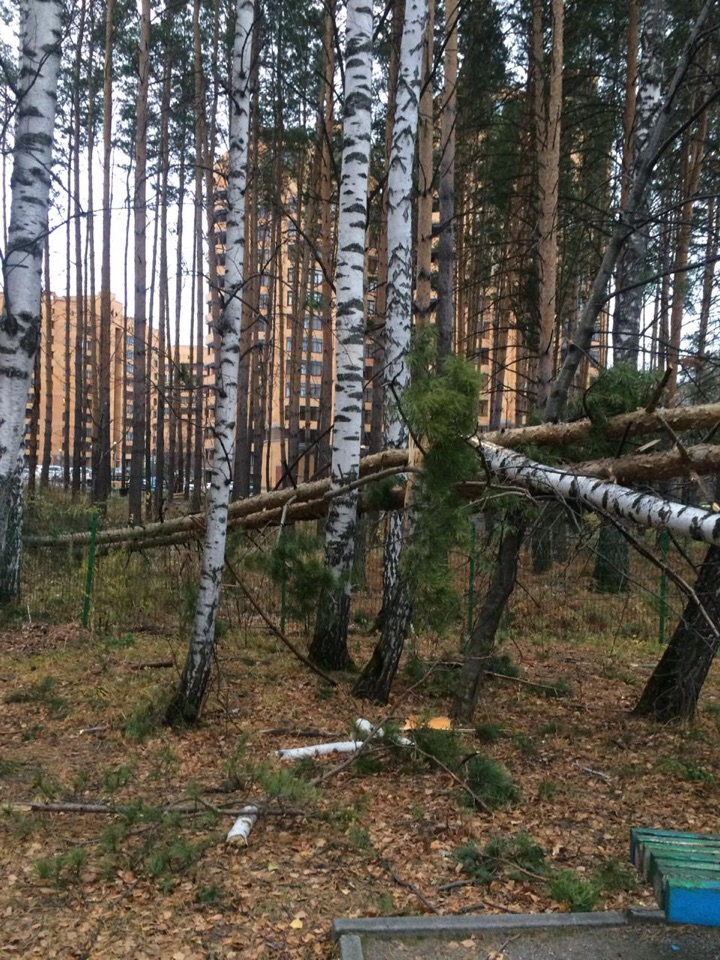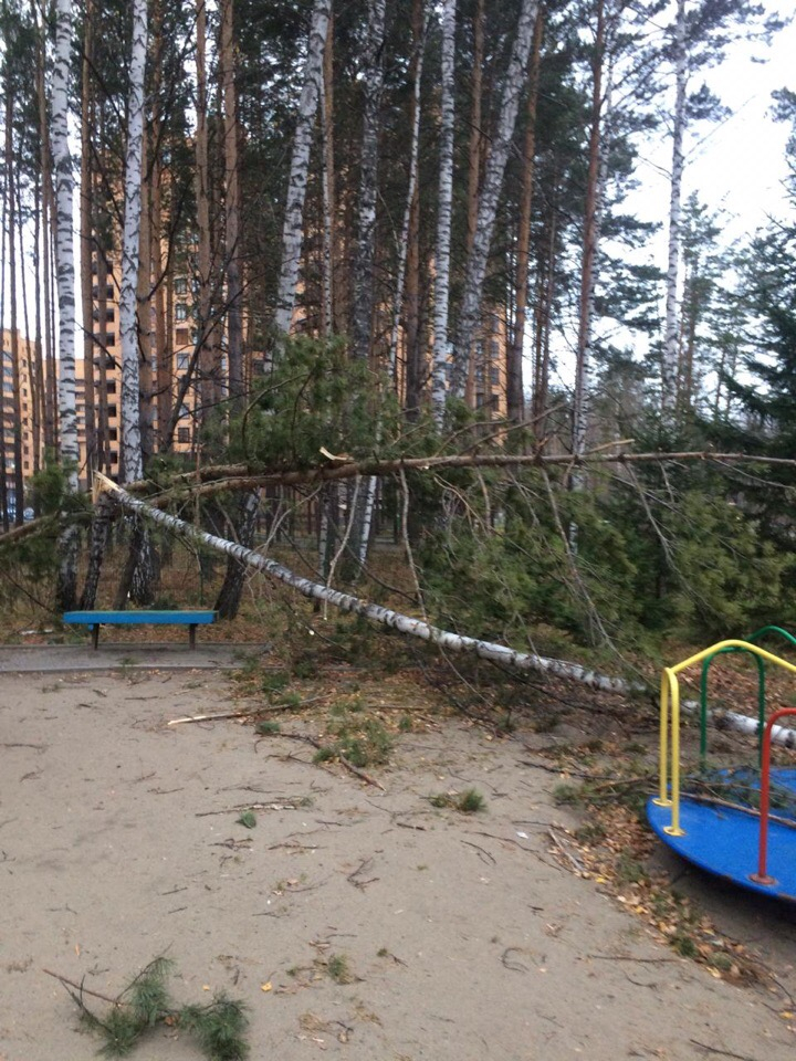 Еще две сосны, падая, зацепили березу во дворе дома по проспекту Академика Коптюга, 5, прямо рядом с детской площадкой. Три дерева рухнули, детская площадка не пострадала. На улице Иванова, 35а со строительного вагончика ветром сорвало крышу и она упала на стоявший рядом автомобиль. В итоге разбито заднее стекло машины, поврежден спойлер и срезана антенна.