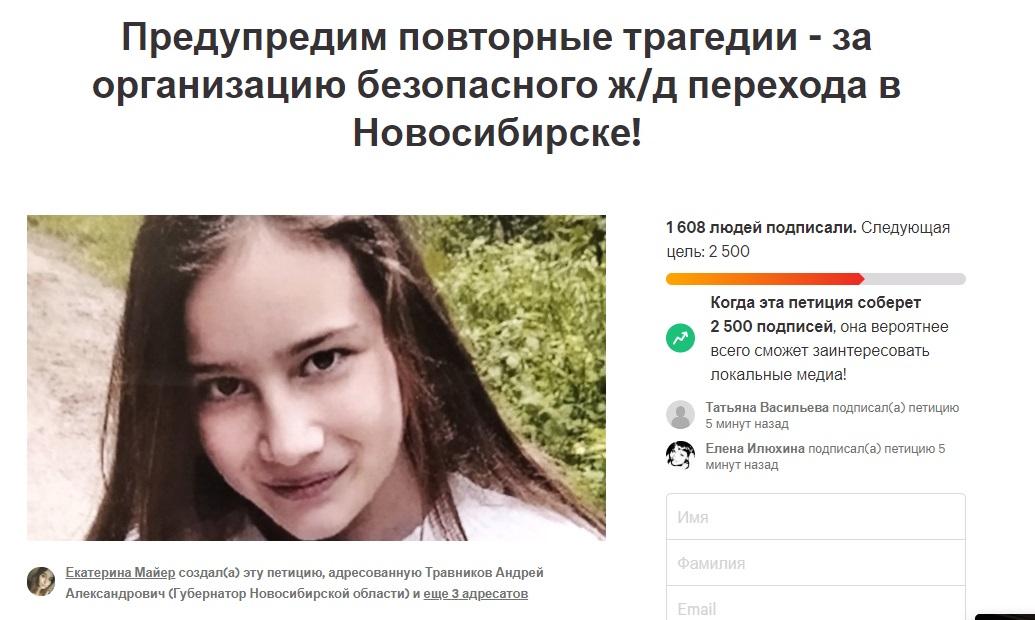 Петиция создана Екатериной Майер и адресована губернатору Новосибирской области Андрею Травникову, мэру Новосибирска Анатолию Локтю, депутату горсовета Наталье Пинус и гендиректору ОАО «Российские железные дороги» Олегу Белозерову.