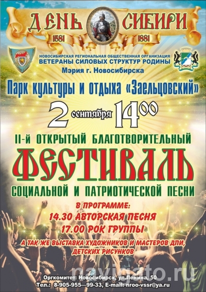 2 сентября в парке культуры и отдыха «Заельцовский» (ул. Парковая, 88) пройдёт II открытый фестиваль социальной и патриотической песни «День Сибири».