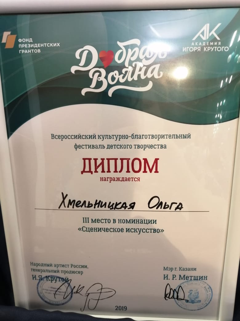 Как рассказывал в августе «Навигатор», две девочки из Советского района, Ольга Хмельницкая и Диана Евстратова, успешно прошли отборочный тур и получили шанс выступить на всероссийском фестивале. И вот замечательная новость: 13-летняя Ольга Хмельницкая заняла третье место в номинации «Сценическое искусство»!
