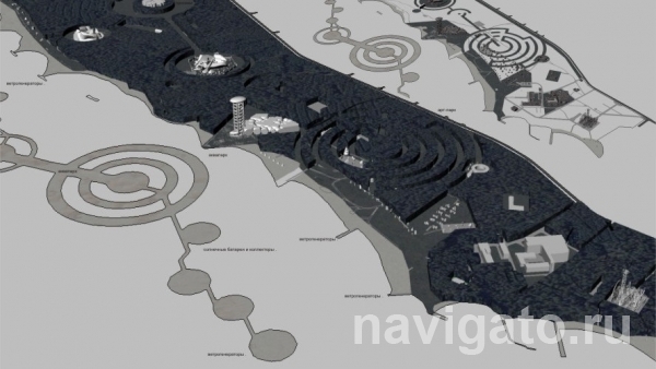 По словам Натальи Алексеевой, облик и характер территории сформирует организованный по принципу регулярного парка, где ландшафт будет сочетаться с ансамблем выразительных, необычных, абсолютно функциональных архитектурных объектов бионических форм. В проекте Андрей Чернов формирует регулярный ландшафт, санируя существующий давно заброшенный и дикорастущий парковый лес, художественно «вырезая» круги-поляны вокруг новых архитектурных сооружений. Новые объекты – это теплые павильоны, галереи, театр, экспоцентр, гостиница, кемпинги, ледовый стадион, аквапарк и детский центр. Поскольку все они будут построены из дерева, то органично впишутся в природный контекст.