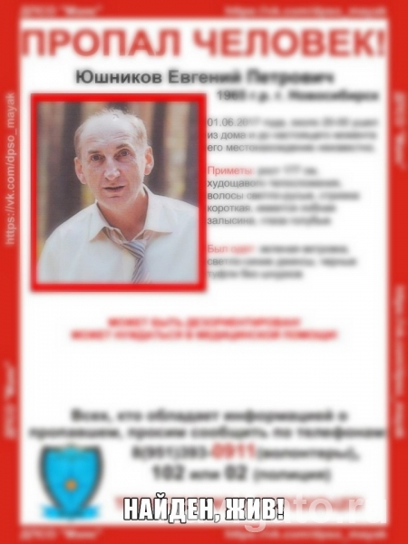 52-летнего Евгения Юшникова, пропавшего 1 июня, нашли живым. Напомним, что мужчина вышел из дома в Нижней Ельцовке и ушел в неизвестном направлении.