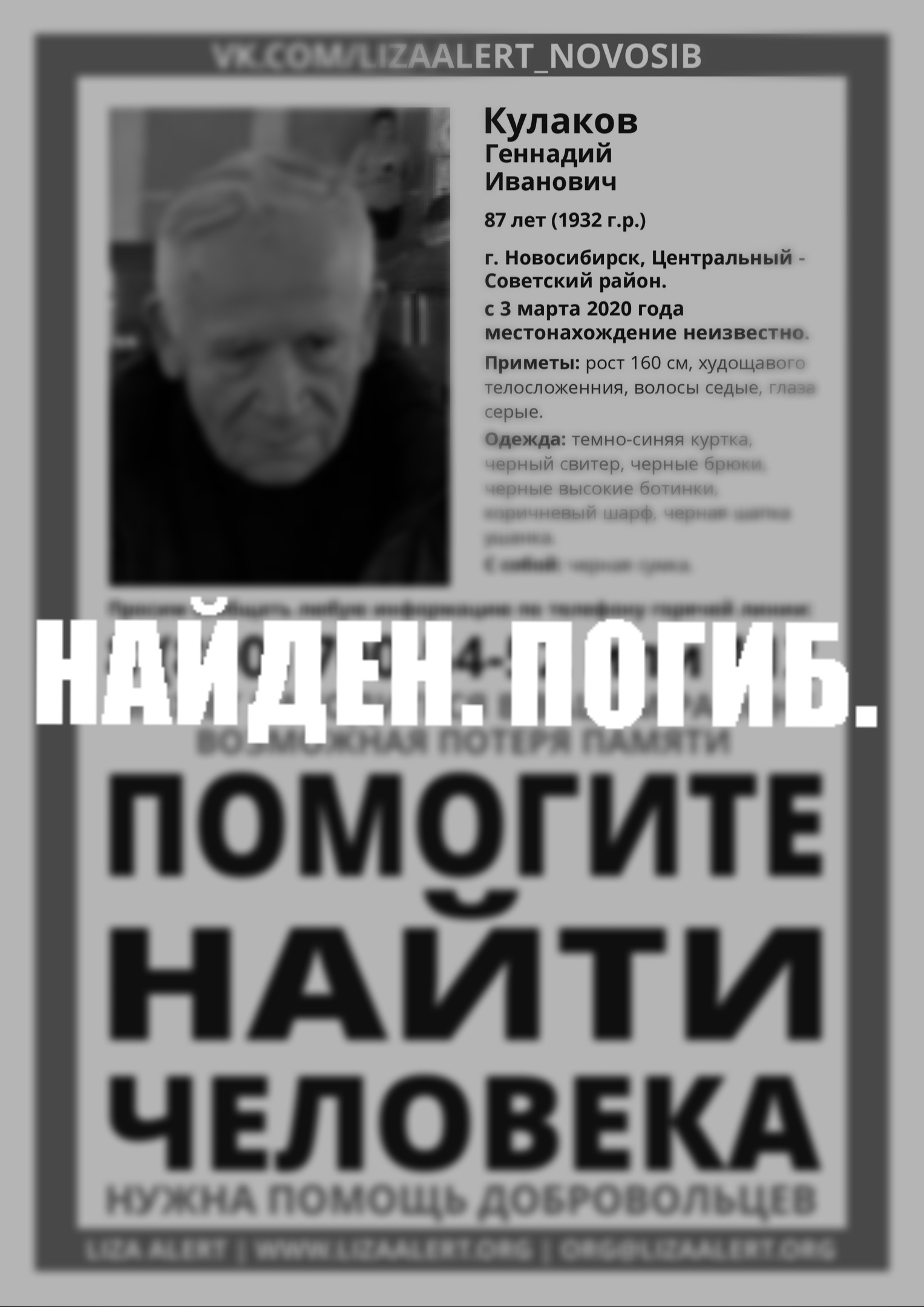 Геннадий Кулаков ушел из Института горного дела СО РАН 3 марта 2020 года. Когда 88-летний мужчина не вернулся домой после работы, родственники забили тревогу и обратились в полицию.
