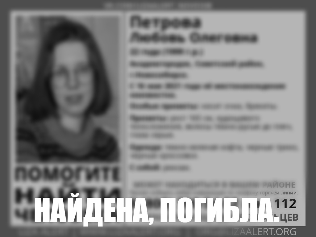 О том, что поиски пропавшей 16 мая 22-летней Любови Петровой завершены, сообщили в поисковом отряде «Лиза Алерт Новосибирск».