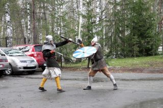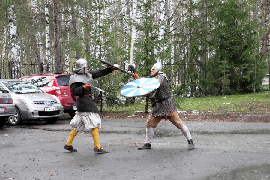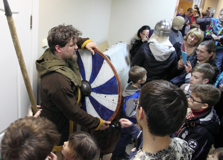 Прибывавших на мероприятие гостей встречали студенты-волонтёры, переодетые в людей каменного века – в шкурах и с орудиями труда тех времён. Были здесь и средневековые рыцари в полной боевой амуниции – в настоящих кольчугах, с мечами и саблями. Они участвовали в мастер-классе «Костюмированная реконструкция средневекового боя», которую организовали клубы исторической реконструкции «Северный берег» и «Северная звезда».