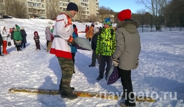 На два часа футбольное поле на ул. Лесосечной превратилось в площадку для традиционных народных забав: песен, хороводов и молодецких игр. Парни и девушки НГДОО «Потешные полки» под руководством четы Навальневых организовали борьбу подушками на бревне, стрельбу из лука, русский хоккей.
