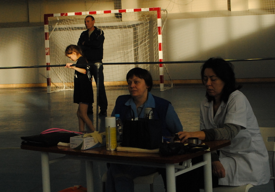 Рядом с рингом – стол, за которым сидят специалисты скорой помощи. Возле спорткомплекса на всякий случай дежурит машина скорой – так положено, спорт ведь контактный. Помощь медработников, к счастью, не востребована.