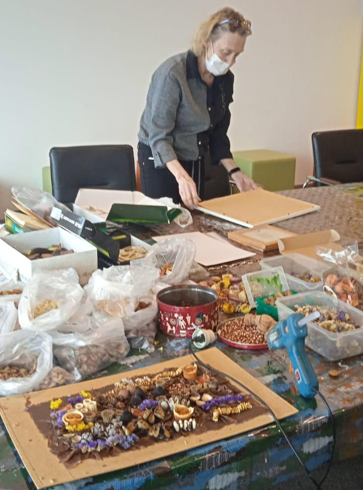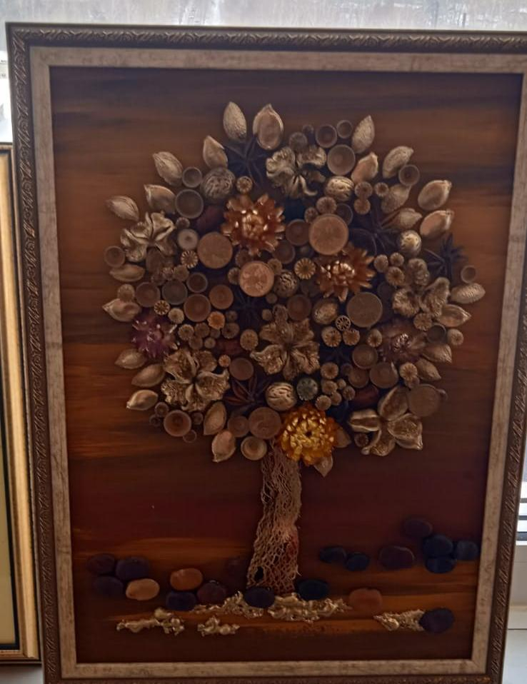 Реально ли производить новое, не разрушая то, что когда-то было создано самой природой? Об этом рассказали участницы флористического клуба «Сакура» Ольга Ширяева и Елена Елькина. Затейливые коллажи и плоскостные композиции созданы из высушенных листьев и лепестков, аккуратных спилов сломанных веток и пищевых отходов, которые обычно принято выбрасывать: косточки и семечки разных плодов, скорлупа орехов и сухая кожура цитрусовых. Природные материалы почти не требуют подкрашивания и лакировки, имеют органичные контуры и естественные цвета.
