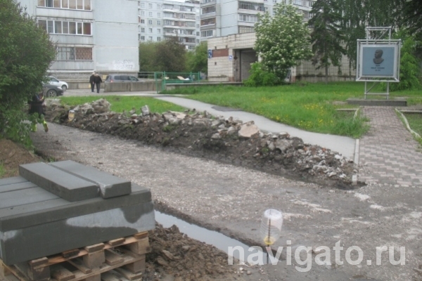Пешеходная дорожка была уложена еще при жизни великого строителя и с тех пор ни разу не реставрировалась. Планируется, что ее с двух сторон обнесут поребриком и заново заасфальтируют. Работы ведутся медленно из-за капризов сибирской природы: в траншеях для установки ограждений стоит дождевая вода. Надеемся, что благоустройство памятного уголка ко Дню строителя будет закончено.