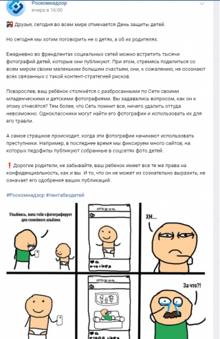Повзрослев, ваш ребёнок столкнётся с разбросанными по Сети своими младенческими и детскими фотографиями. Вы задавались вопросом, как он к этому отнесётся? Тем более что Сеть помнит всё, ничего удалить оттуда невозможно. Одноклассники могут найти его фотографии и использовать их для его травли. А самое страшное происходит, когда эти фотографии начинают использовать преступники. Например, в последнее время мы фиксируем много сайтов, на которых педофилы публикуют собранные в соцсетях фото детей, – пишет Роскомнадзор.