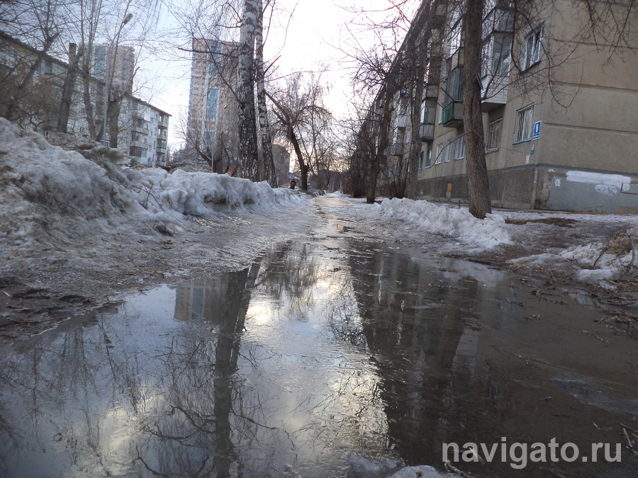 Весна лишила жителей улицы Молодости пешеходной дорожки, превратив её в длинную лужу из воды и грязно-снежного месива.