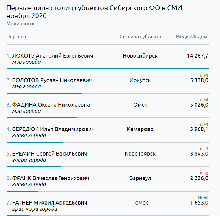 По сообщению издания Новосибирские новости, мэр Новосибирска лидирует почти с трёхкратным отрывом от ближайшего коллеги. На втором месте глава Иркутска Руслан Болотов, на третьем мэр Омска Оксана Фадина. Отметим, что анализ данных проводился за ноябрь.